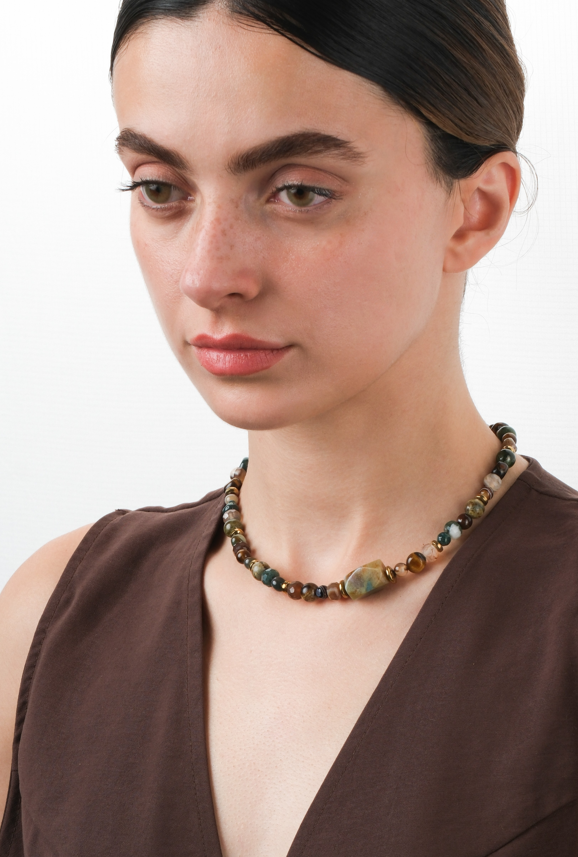 Tiger eye, agate, moss agate, hematite, green garnet, diopside, 24K gold-plated steel